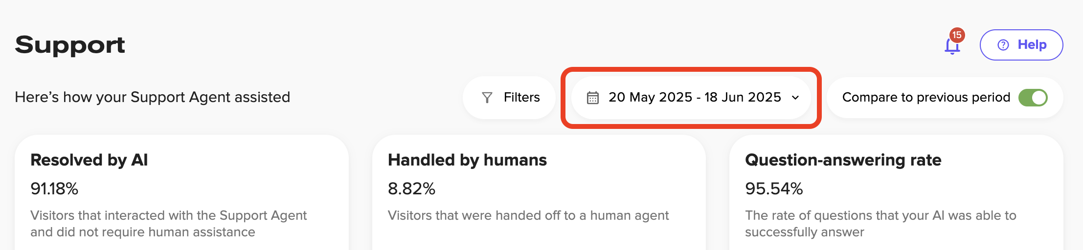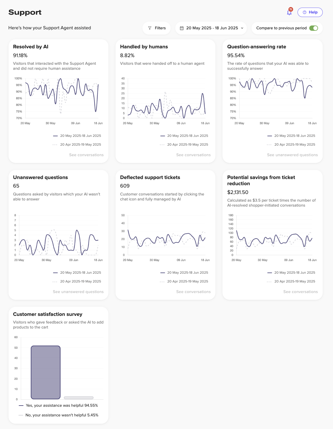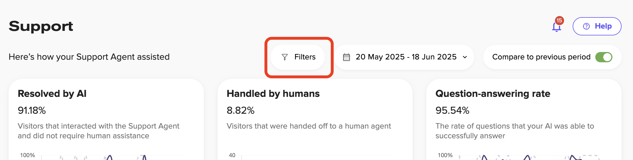 The dashboard cards listed below appear at the top of the Support Analytics page, providing key metrics about your AI's support performance.