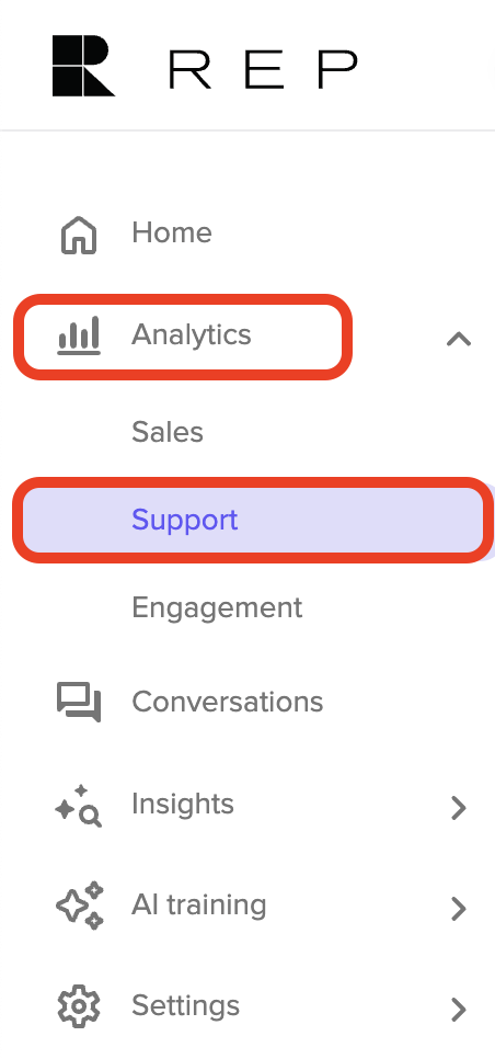 The Support Analytics page provides you with comprehensive insights into how Rep's AI handles customer support interactions and reduces your support workload. This dashboard shows performance metrics from AI-powered customer service conversations and support ticket deflection.