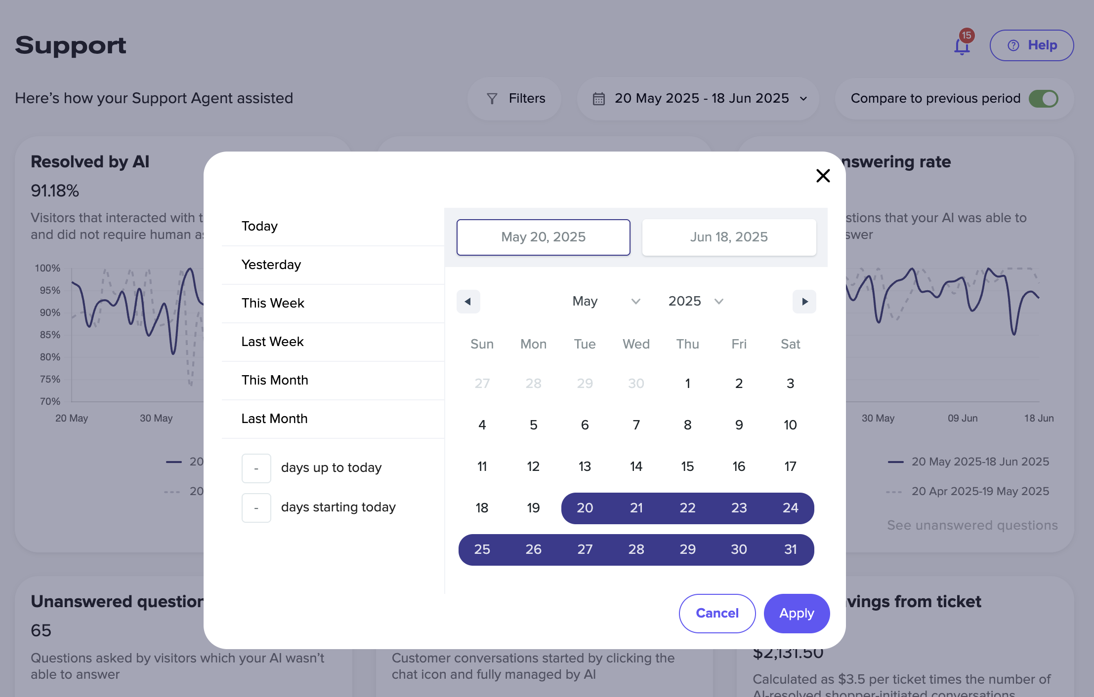 Clicking the date range opens a calendar selector. Select a start date and end date to analyze support performance for specific time periods.