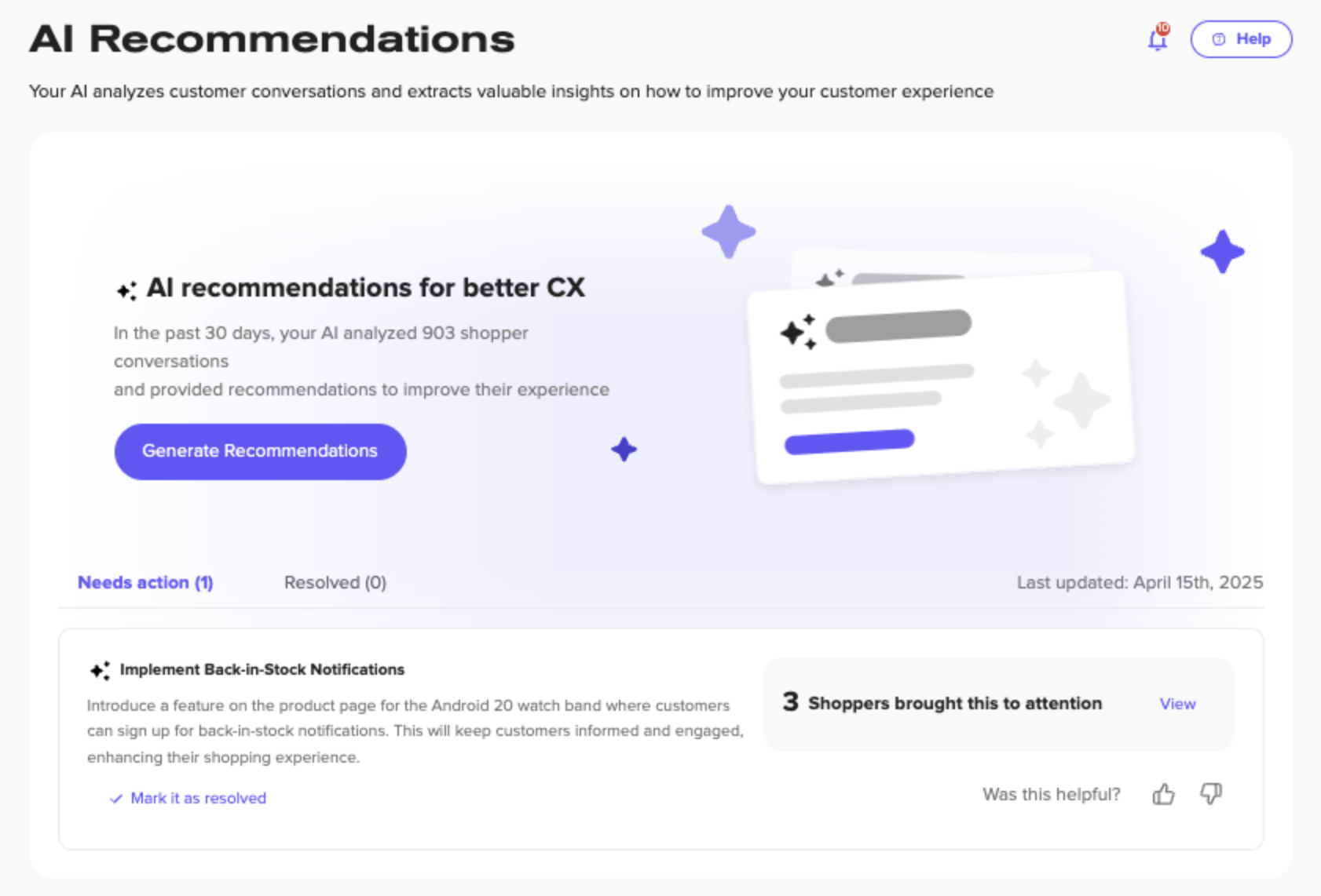 By leveraging AI to understand customer interactions, this feature transforms real shopper interactions into prioritized recommendations that help you address unmet needs and reduce friction points.