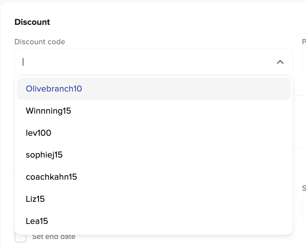Select a static discount code from your Shopify store from the dropdown. You can also search for the code by name in the field's search bar.