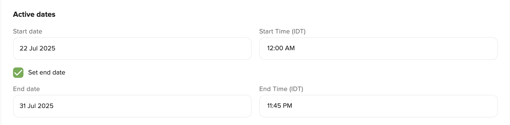 To use this field, click the checkbox next to Set End Date, then enter the end date and time.