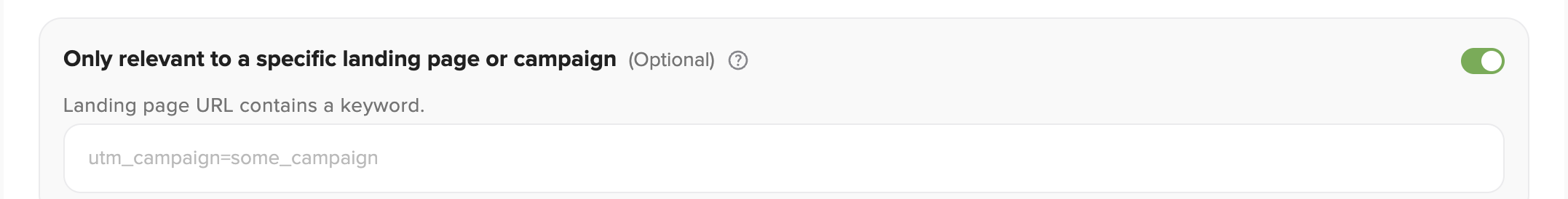The "Only relevant to a specific landing page or campaign" toggle is an optional field. This field allows you to segment the promotion for a specific audience by using UTM parameters or identifying the landing page they visited. Include a unique keyword from the campaign's landing page URL to ensure precise targeting.